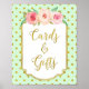 Cartões e dotes mesa de sinal de poster para chá de fraldas ou festa de aniversário em padrão verde-menta e de pontos dourados com borda dourada, flores cor-de-rosa-rústica e cor-de-água de pêssego e caracteres de estilo manuscritos.