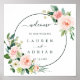 Este sinal de boas-vindas do casamento apresenta flores pintadas de aquarela em uma folhagem cor-de-rosa, branca e verde com uma estrutura em círculo. Para personalização mais avançada deste design, clique no link "Personalizar mais". Itens correspondentes também estão disponíveis.