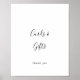 Este simples cartão minimalista e sinal de presentes é perfeito para um casamento ou chá de panela moderno. O design simples e elegante apresenta a tipografia de scripts clássicos e ricos em preto e branco. Faça a linha de texto na parte inferior da placa sua incluindo a data, os nomes da noiva e do noivo ou uma mensagem curta como "Obrigado". Esta placa pode elogiar um casamento, qualquer evento ou festa.