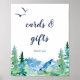 Este cartão e sinal de presentes da Montanha Rochosa é perfeito para um casamento ou chá de panela ao ar livre. O design apresenta uma paisagem de natureza selvagem pintada, azul e verde, com pinheiros de aquarela, pássaros e montanhas. A linha de texto na parte inferior da placa pode ser personalizada com a data, os nomes da noiva e do noivo, ou uma mensagem curta como "Obrigado". Este sinal pode ser usado para um casamento ou qualquer evento ou festa.