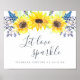Projetado para combinar com a nossa coleção de casamento Flowerfields, esta placa floral rusticada convida convidados para o casamento para celebrar o feliz casal com um faísca. Personalize com duas linhas de texto personalizado no roteiro de caligrafia e na letra de serifa tradicional (mostrada com "Let Love Sparkle: sparkler sendoff at [time]"), com uma borda de girassóis amarelos e de girassóis azuis marinhos.