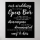 Poster/sinal a ser colocado em seu próprio quadro. Para um bar aberto. "Nosso casamento terá um bar aberto. Também será fotografado pesadamente. Assim, qualquer xenanige bêbado estará bem documentado por anos. Continue com cuidado. Amor, o casal." Nomes personalizados. Outras cores de fundo disponíveis mediante pedido. Projetado para uma estrutura 8x10.