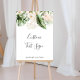 Este sinal de texto personalizado com folhagem floral tropical dourada é perfeito para um casamento rústico ou chá de noiva. O design apresenta folhagem dourada pintada à mão com aquarela e folhagem verde tropical com flores cor-de-rosa elegantes.