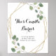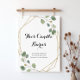 Este sinal de vela acesa com caligrafia geométrica dourada é perfeito para um casamento rústico. O design apresenta ramos e folhas de eucalipto verde botânico desenhados à mão adornando uma moldura geométrica elegante.