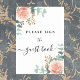Um fundo branco decorado com rosas dourados rosa, florais, flores e verde de eucalipto. Com o texto: assine o livro de hóspedes.