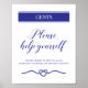 Este fabuloso sinal de casamento impresso a azul-marinho é uma ideia excelente de colocar nos banheiros dos homens ao lado da cesta de bens essenciais que eles podem precisar. Também vai encorajar seus convidados a voltar ao baile!