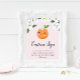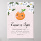 Pequeno símbolo personalizado de chá de fraldas de tema bonito com ilustração aquosa de fruta laranja com coroa floral branca. Sinais de crio como cartas e sinais, bar mimosa, favores, guia, etc. Este sinal cor-de-rosa é excelente para o chá de uma menina.