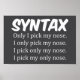 Uma ilustração de tipografia engraçada que tem a palavra sintaxe e algumas frases explicando como a colocação de palavras é importante quando você está escrevendo. A design engraçada é sobre pegar seu nariz. A palavra só é movida para diferentes posições na frase para dar-lhe significados diferentes. Eu só pego meu nariz. Esta é uma design que seria adequada para qualquer pessoa que aprendesse ou ensinasse a língua inglesa.