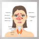 Sinusite, rosto feminino com inflamação da membrana mucosa dos sinos paranasal e frontal Visão frontal da tireoide e traqueia em fundo branco Anatomia dos órgãos humanos