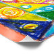 Padrões geométricos vibrantes enchem a imagem, apresentando círculos, triângulos e espirros em um caleidoscópio de cores que incluem azul, verde, amarelo e vermelho. A intrincada design cria um sentido de simetria e equilíbrio.