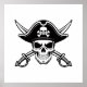 Skull and sabers, pirate skull and crossbones jolly roger grim reaper cartoon wearing captain a hat and eye patch, black and white