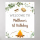 Bem-vindos aos convidados do seu partido com um sinal personalizado adorável. Enquadre o sinal e exiba-o numa mesa perto da entrada ou monte a espuma poster e mostre-a fora em um calcanhar. Este design apresenta as ilustrações de mores e fogueiras desenhadas manualmente com sotaques de água verde.
