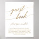 Este elegante sinal de livro de hóspedes de caligrafia em ouro é perfeito para um casamento simples. A design neutra apresenta uma poster minimalista decorada com tipografia falsa de ouro romântica e caprichosa. Nota: Este design não apresenta folha de ouro real. É um gráfico de alta qualidade feito para se parecer com folhas de ouro.