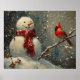 A heartwarming oil painting featuring a cheerful snowman and a bright red cardinal, capturing the cozy magic of wintertime.