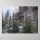 Um vislumbre de um hotel, árvores poeiradas de neve com aspecto adorável em Whistler, B.C. Canadá.