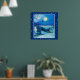 Um fundo de estrelas de neve azul-téal com um boneco de neve e um Papai noel voador no seu trenó enviando renas através da cena de fantasia do céu.