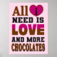 Tudo o que preciso é de amor e mais chocolates, este design apresenta um texto cor-de-rosa e marrom ousado dizendo "Tudo o que preciso é de amor e mais chocolates". Por todos esses amantes de chocolate.