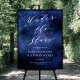 Esta placa de boas-vindas do casamento apresenta um fundo azul escuro no céu, uma tipografia elegante, e um roteiro de caligrafia que diz "Sob as Estrelas". Essa design seria perfeita para qualquer um com um casamento noturno, ou qualquer pessoa interessada em astronomia e espaço.