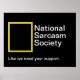 Fundo preto com retângulo dourado e texto branco da "Sociedade Nacional do Sarcasmo - como precisamos do vosso apoio". Poster engraçada que tem certeza de ter um sorriso ou um ronco!