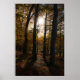 Uma bela fotografia com um sol de outono na floresta. O sol brilha através das folhas amarelas na floresta escura, criando sombras longas no chão, e uma pequena lente azul flare. Adicione texto ou personalize se quiser.