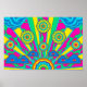 Esta é uma ilustração muito colorida e fantástica que apresenta uma paisagem estilizada ou céu com um sol proeminente no fundo. O sol é representado por anéis concêntricos e padronizados em tons de rosa, laranja e amarelo. Raios negros, radiantes em amarelo vibrante, verde neon, rosa quente e azul se estendem para cima. Dentro dos raios estão formas florais estilizadas ou estriadas com pétalas em camadas, cor-de-rosa, amarela e azul. Abaixo estão nuvens azuis únicas, cada uma contendo um solteiro, a olho aberto. Padrões azuis e verdes ondulados enchem a parte superior da imagem. A trabalho de arte tem uma forte estética psicodélica e retrorreflectora, caracterizada por contornos ousados e cores planas e saturadas, criando uma vívida cena sonhadora. (projetado por freepik)