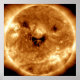 Esta imagem de um sol turbulento parece um rosto feliz sorrindo. Foi capturado pelo Observatório de Dinâmica Solar da NASA, um satélite que observa o Sol desde 2010. As manchas escuras que parecem olhos e boca são na verdade buracos coronais que são regiões mais frias. A turbulência na superfície do sol pode resultar em tempestades solares que produzem belas Auroras e interferem com comunicações de rádio e satélite.