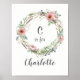 Esta coroa de aquarela com flores e penas cor-de-rosa adiciona beleza rústica e elegante à sua decoração doméstica. O texto está na cinza. Tanto a cor de fundo quanto o estilo e a cor do texto podem ser personalizados. Isso pareceria impressionante em uma enfermaria ao adicionar o nome de seu filho.