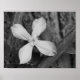 Flor clematis bonito aninhada na fala de uma velha roda de vagão feita a preto e branco. Fotografia da Flor por Susan.