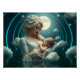 "Uma mesa de papel sereno, semelhante a um sonho, que apresenta uma mãe com pele lisa de porcelana e cabelo de papel cortado intricadamente a creme fluindo em espirais e padrões elegantes. Idosa, ela berra seu bebê dormindo, que também tem pele lisa e veste uma delicada roupa de papel creme adornada com padrões cortados como rendas. Ambas as figuras são trabalhadas com detalhes meticulosos, cujas formas suaves parecem flutuar ou descansar suavemente em um vapor ou nuvens volumosos, como as nuvens, dentro de um vasto túnel cilíndrico futurista. O túnel é composto por anéis brilhantes segmentados em materiais translúcidos e lacustres escuros, embutidos com intrincados padrões de luz e incontáveis partículas pequenas e espumantes que lembram estrelas distantes. Abaixo das figuras flutuantes, a água refletora escura espelha o brilho do túnel e a iluminação suave e etérea à volta da mãe e da criança, melhorando a qualidade mística da cena. No extremo distante do túnel, uma lua de cheio luminosa pendura num céu azul vago e pálido, lançando uma luz de fundo suave e mística que silhueta a cena. A iluminação é cinematográfica e atmosférica, com um brilho suave, quente, dimensional que emana sutilmente da mãe e da criança ou que a ilumina, enfatizando suas delicadas formas de papelaria em camadas. Esse contraste com a legal e misteriosa ambição do túnel luminoso e da lua cria uma atmosfera surreal e espiritual. A cena evoca um profundo sentimento de amor materno entrelaçado com a maravilha futurista — um santuário tranquilo e de outro mundo que se sente tenro e inspirador de admiração."