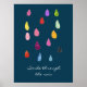 Design de gotas de chuva padronizadas, muito bonitas e coloridas, com um tema "boho". Criativo e parte contra um fundo azul marinho. Colagem padrão, colagem, estilo arco, gotas de chuva com Sorriso através da citação inspiradora da chuva.