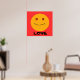 Um rosto bonito com um olhar de amor e corações vermelhos para os olhos com um belo fundo vermelho e a palavra amor escrita em preto por baixo.