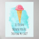 Um poster de trocadilho engraçado que diz "Sorvete porque você está me deixando louco". Ilustrado com um delicioso desenho de cone de sorvete, com uma colher de sorvete de morango rosa segurada por um cone de waffle. Colocado num penso/pincelada de tinta azul-aqua.