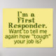 Aqui se lê: "Sou o Primeiro Respondente. Quer me dizer de novo como seu trabalho é "duro"? Para as pessoas com os empregos que são realmente duros; a polícia, bombeiros, resgate e outros trabalhadores de emergência e voluntários.