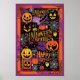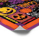 Uma ilustração vibrante e intrincada dos padrões de Halloween, com uma variedade de símbolos icônicos como jack-o-lanternas, morcegos, aranhas e teias de cópulas, colocados contra um fundo laranja e roxo quente e estranho, com linhas ousadas, formas geométricas e fontes estilizadas, incorporando sombras de preto, amarelo e vermelho para criar uma atmosfera festiva e assustadora, com detalhes intrincados e texturas que evocam o espírito da época das bruxas.