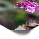 A butterfly with intricate patterns on its wings perches delicately on a vibrant purple flower, surrounded by lush green foliage. The scene captures the delicate interaction between the butterfly and the blooming flora in a moment of natural beauty.
