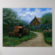 Primavera chegou à fazenda e o velho trator descansa depois de arar os campos. Impressão de uma pintura