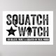 Esteja atento para o SQUATCH! Acredito que há uma praça nesta floresta! Texto de bloco de estilo encolhido e angustiado com duas criaturas de sasquatch patudo nas letras. Junte-se ao relógio de equipe!