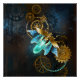 Barbeiro véu com asas transparentes azuis e lâmpada verde sobre fundo vestido, marrom, texturizado. Estilo Steampunk.
