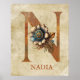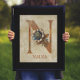 impressão de poster com uma letra de aparência floral e de metal enferrujado "N" em um local de colheita e fundo de pergaminho. Disponível em formato de impressão e download digital.