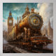 Vestido em um encanto de outro mundo, que dobra o tempo, este impressão reimagina Londres com uma torção de galo como um trovão colossal, com a cabeça de latão à frente.