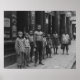 A group of young boys stands on a city sidewalk, with one shirtless boy front and center. The boys are dressed in worn clothing, suggesting a historical setting