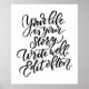 Uma citação inspiracional escrita à mão num roteiro fluido e caligráfico. "Sua vida é sua história. Escreva bem. Editar com frequência."