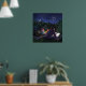 A arte Starry Night de Traci Van Wagoner impressão, posters, acessórios e presentes mostra nossa pintura original de duas crianças e seu grande e negro cão acampando sob as estrelas lendo um livro fantástico ao redor de um fogo no acampamento sobre cavaleiros e dragões. A magia da história está subindo no céu estrelado para mostrar um cavaleiro e um dragão numa dança eterna noturna de estrelas. Aproveite um acampamento noturno de verão nas montanhas.