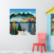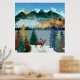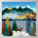 Uma bela paisagem com cores e texturas únicas mostrando uma paisagem de montanha e lago e uma floresta multicolorida com um sol ascensão e um alce em tons de azul, verde, ouro e magenta.
