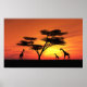 Esta imagem mostra um pôr do sol idílico com girafa e cacia guarda-chuva