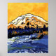 Uma pintura do Monte Rainier com um pôr do sol amarelo brilhante.