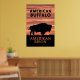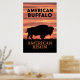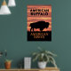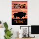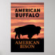 Uma silhueta de um bisonte americano em pé contra um pôr do sol laranja vibrante.