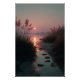 A narrow stream meanders through tall reeds toward a glowing sunset, where the sun rests low and soft on the horizon in pale peach and rose. Stepping stones lead through shallow water that mirrors the warm sky, while long grasses in burgundy and gold catch the final light against a misty, lavender-blue dusk. The composition captures profound stillness, gentle endings, quiet renewal, the beauty of ordinary nature at twilight, and the peace found in small, unhurried places—perfect for meditation corners, bedrooms, home offices, therapy spaces, minimalist living areas, or as soothing gifts for anyone seeking calm, mindfulness, nature connection, or daily reminders of quiet beauty.