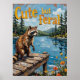 Essa pintura única apresenta um guaxinim como figura solitária em um píer de madeira, com seu olhar voltado para o lago tranquilo. O fundo é um belo pôr do sol, com laranjas ricas e amarelos se misturando com a água azul. As pinceladas grossas e texturizadas dão à cena uma qualidade de sonho. A frase "Cute mas selvagem" é escrita de forma destacada em caracteres distintos, destacando a dupla natureza do animal contra a paisagem pacífica.
