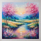 Representação vibrante de uma cena natural tranquila que apresenta um rio sereno, árvores florescentes e cores vivas capturando um pôr do sol radiante.